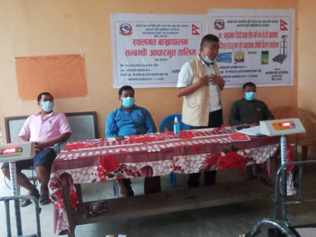 कार्यक्रममा बाख्रा पालन समुहका कृषकहरुलाई पशु सेवा कार्यलयका पशु प्राबिधिक राजेश पाण्डे , बाशु भण्डारी र बिमल पराजुलीले प्रशिक्षण दिनु भएको थियो।
